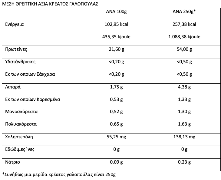 Η θρεπτική αξία της γαλοπούλας της Αμερικανικής Γεωργικής Σχολής παρουσιάζεται στον παρακάτω πίνακα.