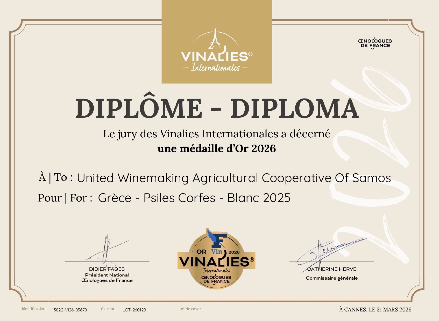 Samos Vin Doux 2025 – ΜΕΓΑΛΟ ΧΡΥΣΟ (Grand Or): Ο «βασιλιάς» των γλυκών κρασιών κατέκτησε την ανώτατη δυνατή διάκριση. Με το λαμπερό του χρυσαφένιο χρώμα και τα μελωμένα αρώματα βερίκοκου, μαρμελάδας και καραμέλας, απέδειξε γιατί θεωρείται σε όλον τον κόσμο ένα διαχρονικό οινικό αριστούργημα.