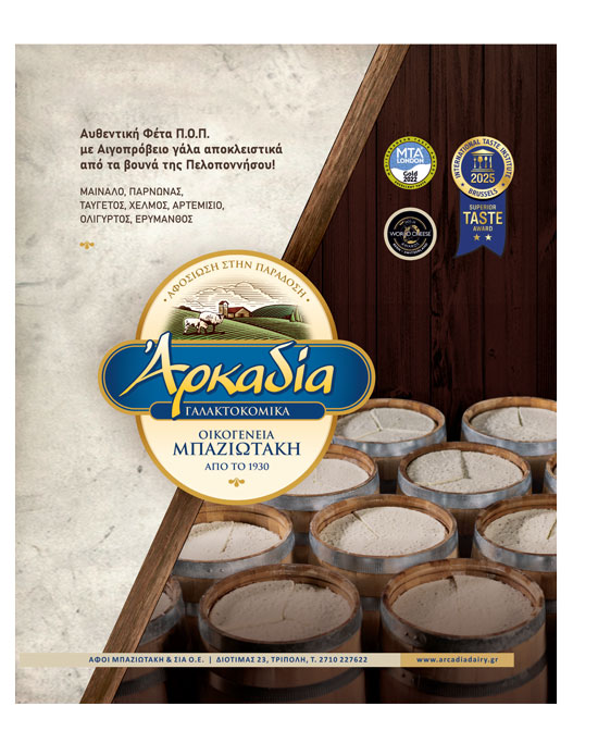 Παραδοσιακό, βραβευµένο ΠΟΠ τυρί από 100% αιγοπρόβειο γάλα, γνωστό για την πλούσια, µεστή γεύση και τη βαρελίσια ωρίµανσή του είναι η Φέτα της οικογένειας Μπαζιωτάκη, η οποία διατίθεται και σε σύγχρονες συσκευασίες. Μια boutique οικογενειακή επιχείρηση µε έδρα το Ζευγολατιό Αρκαδίας, που βάζει στα ψυγεία πολλών σηµείων λιανικής µία ευρεία γκάµα από προϊόντα.