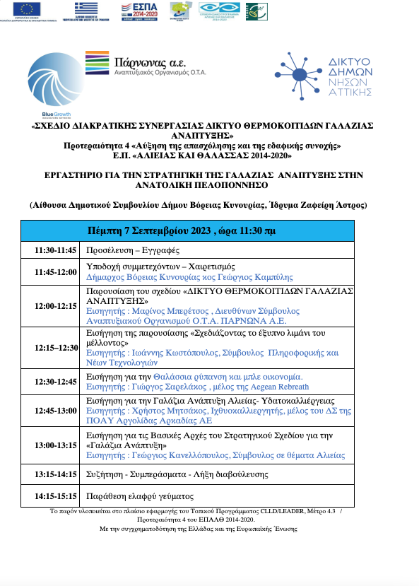 Η Αναπτυξιακή Πάρνωνα Α.Ε. Α.Ο.Τ.Α. στο πλαίσιο υλοποίησης του Διακρατικού Σχεδίου «ΔΙΚΤΥΟ ΘΕΡΜΟΚΟΙΤΙΔΩΝ ΓΑΛΑΖΙΑΣ ΑΝΑΠΤΥΞΗΣ» (BLUE GROWTH INCUBATORS NETWORK) Προτεραιότητα 4 «Αύξηση της απασχόλησης και της εδαφικής συνοχής» Ε.Π. «ΑΛΙΕΙΑΣ ΚΑΙ ΘΑΛΑΣΣΑΣ 2014-2020» θα διοργανώσει Εργαστήριο για την Στρατηγική της Γαλάζιας Ανάπτυξης στην Ανατολική Πελοπόννησο στο Άστρος Αρκαδίας στη αίθουσα του Δημοτικού Συμβουλίου του Δήμου Βόρειας Κυνουρίας, Ίδρυμα Ζαφείρη, στις 07/09/2023, ημέρα Πέμπτη και ώρα 11:30 π.μ