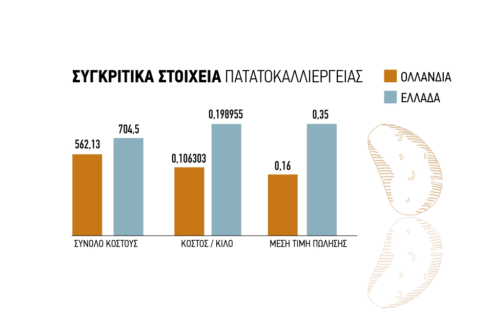 Κι όµως, οι Ολλανδοί πατατοκαλλιεργητές εµφανίζουν µικρότερα περιθώρια κέρδους ανά στρέµµα σε σχέση µε τους Έλληνες συναδέλφους τους. Βέβαια το βιοµηχανικό πρότυπο της καλλιέργειας και η παράλληλη εγκατάλειψη του χαρακτηρισµού της πατάτας ως «κηπευτικό» είναι σε θέση να τους εξασφαλίσουν ένα σχετικά σταθερό εισόδηµα, υψηλότερο σε σχέση µε την υπόλοιπη Ευρώπη.