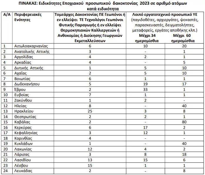 – οι τομεάρχες δακοκτονίας, 214 άτομα ΠΕ Γεωπόνοι ή εν ελλείψει ΤΕ Τεχνολόγοι για χρονικό διάστημα 6,5 μηνών,