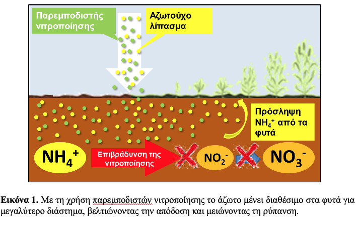 Για να περιοριστούν οι απώλειες αζώτου και να αυξηθεί η αποδοτικότητα της λίπανσης, έχουν αναπτυχθεί διάφορες τεχνολογίες που ωφελούν τόσο το εισόδημα του παραγωγού όσο και το περιβάλλον. Μία από τις πιο σημαντικές είναι η χρήση πρεμποδιστών νιτροποίησης (ΠΝ), δηλαδή ουσιών που επιβραδύνουν τη μικροβιακή μετατροπή των αμμωνιακών ιόντων (NH4+) σε νιτρικά (NO3-). Οι παρεμποδιστές αυτοί παρατείνουν τον χρόνο κατά τον οποίο το άζωτο του λιπάσματος παραμένει διαθέσιμο στο έδαφος για απορρόφηση από τα φυτά από 6–8 εβδομάδες σε 8–16 εβδομάδες. Αυτό οδηγεί σε καλύτερη αξιοποίηση του αζώτου και, έμμεσα, σε αύξηση των αποδόσεων σε κηπευτικά και σιτηρά κατά 2–4.5%.2. Η σημασία τους φαίνεται και από τα οικονομικά στοιχεία: η παγκόσμια αγορά παρεμποδιστών νιτροποίησης αποτιμήθηκε σε περίπου 1.6 δισεκατομμύρια δολάρια το 2023 και αναμένεται να ξεπεράσει τα 2.6 δισεκατομμύρια δολάρια μέχρι το 2030.3 Παρά τη ραγδαία ανάπτυξη όμως, η παγκόσμια χρήση βασίζεται κυρίως σε τρεις μόνο ουσίες: dicyandiamide (DCD), 3,4-dimethylpyrazole phosphate (DMPP) και nitrapyrin.