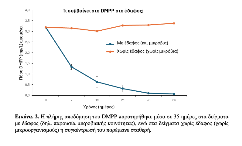 Για τις ανάγκες του προγράμματος FRIDA, συλλέχθηκαν διαφορετικά εδάφη: με προηγούμενο ιστορικό εφαρμογής παρεμποδιστών νιτροποίησης, καθώς και εδάφη όπου δεν είχαν χρησιμοποιηθεί ποτέ παρεμποδιστες. Τα εδάφη αυτά υποβλήθηκαν σε εργαστηριακό πείραμα με επαναλαμβανόμενες εφαρμογές των παρεμποδιστών, σε δόσεις αντίστοιχες με εκείνες που εφαρμόζονται στις καλλιέργειες. Συνολικά έγιναν επτά εφαρμογές μέσα σε 3,5 χρόνια (Σεπτέμβριος 2022 – Μάρτιος 2025), με ενδιάμεσες φάσεις στέρησης θρεπτικών ώστε να ενισχυθεί η πιθανότητα εμφάνισης μικροοργανισμών με ικανότητα αποδόμησης. Η αρχική υπόθεση ήταν ότι η βιοαποδόμηση θα εμφανιζόταν πιο εύκολα σε εδάφη με προηγούμενη έκθεση σε ΠΝ, καθώς εκεί πιθανόν να είχαν ήδη επιλεγεί οι «κατάλληλοι» μικροοργανισμοί. Όμως, τα αποτελέσματα ήταν ανατρεπτικά. Η πλήρης αποδόμηση του παρεμποδιστή DMPP παρατηρήθηκε μέσα σε 28–35 ημέρες σε δείγματα εδάφους από ορυζώνα, όπου ο συγκεκριμένος ΠΝ δεν είχε χρησιμοποιηθεί ποτέ εκτός εργαστηρίου. Μόλις επτά εφαρμογές σε εργαστηριακές συνθήκες ήταν αρκετές για να επιλεγούν μικροοργανισμοί ικανοί να το διασπούν. Το εύρημα αυτό μας οδηγεί σε έναν προβληματισμό: αν η διαδικασία μπορεί να συμβεί τόσο γρήγορα στο εργαστήριο, τι μπορεί να συμβεί σε χωράφια όπου ο ίδιος ΠΝ εφαρμόζεται συστηματικά εδώ και δεκαετίες;