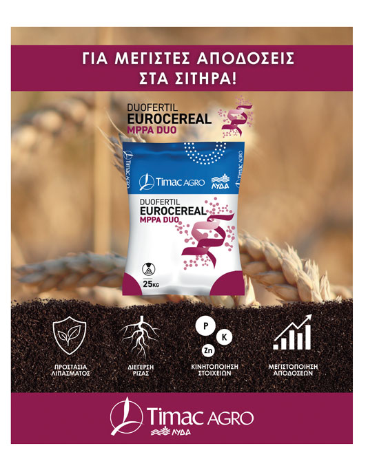 Ειδικά τις τελευταίες χρονιές, που οι οικονοµικές απολαβές των σταροπαραγωγών είναι πιεσµένες, το καλλιεργητικό σκεπτικό πρέπει να είναι ξεκάθαρο για τον αγρότη: «Επένδυσε στο Duofertil Eurocereal 10-24-0 µε τεχνολογία MPPA DUO, ώστε ο κόπος σου να µετατραπεί σε σωστή απόδοση και πρόσοδο.» Η επιλογή µιας φθηνής λύσης, µπορεί να φαίνεται θελκτική, αλλά στο τέλος της καλλιεργητικής σεζόν αποδεικνύεται ζηµιογόνος. Η Timac Agro I ΛΥ∆Α, µε εκτεταµένη εµπειρία στη θρέψη και λίπανση των σιτηρών διαθέτει όλα εκείνα τα λιπάσµατα και σκευάσµατα θρέψης υψηλής τεχνολογίας, ώστε ο παραγωγός να µετατρέψει τον κόπο και την επένδυσή του σε χρήµα.