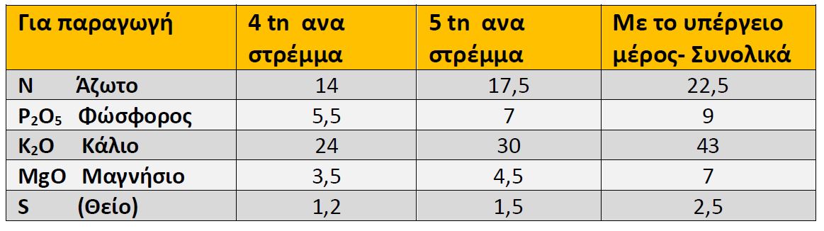 Για να εξασφαλίσουμε επαρκές εδαφικό Κάλιο για υψηλή παραγωγή 5 τόνους/στρέμμα συνιστώνται οι παρακάτω δόσεις λιπασμάτων: