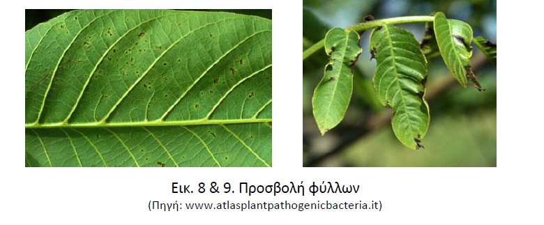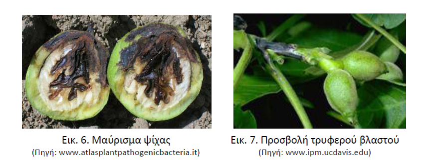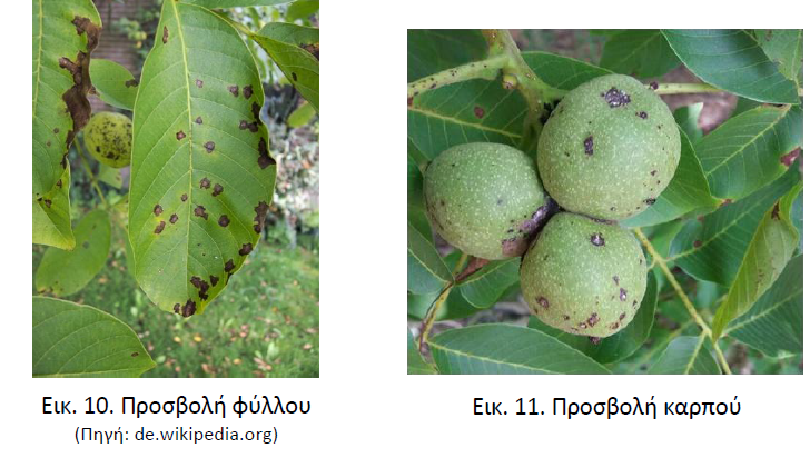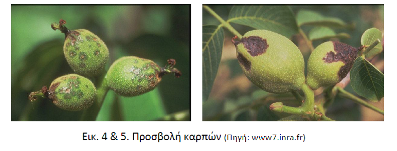-Καρποί. Μικρές, υδατώδεις και βυθισμένες κηλίδες, οι οποίες αργότερα μεγαλώνουν και μαυρίζουν. Στους νεαρούς καρπούς οι προσβολές συνήθως ξεκινούν από την άκρη, στην περιοχή του αποξηραμένου στίγματος (εικόνα 5). Οι μικροί καρποί πέφτουν, ενώ αν η μόλυνση γίνει αργότερα έχουμε μαύρισμα της ψίχας και πρώιμη πτώση του καρυδιού.