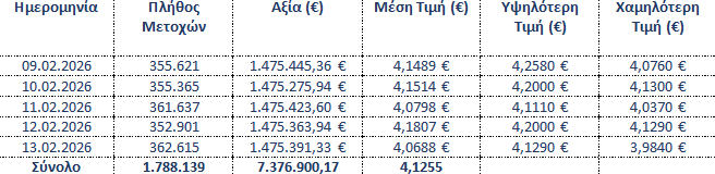 Η «Τράπεζα Eurobank Ανώνυμη Εταιρεία» (εφεξής η «Eurobank» ή η «Τράπεζα»), σε συνέχεια της από 12.12.2025 ανακοίνωσής της σχετικά με την έναρξη εφαρμογής του Προγράμματος Επαναγοράς Ιδίων Μετοχών («Πρόγραμμα»), το οποίο εγκρίθηκε με την απόφαση της Έκτακτης Γενικής Συνέλευσης των Μετόχων της Τράπεζας στις 22.10.2025, σύμφωνα με το άρθρο 49 του ν. 4548/2018, σε συνέχεια του αντίστοιχου προγράμματος της «Eurobank Ergasias Υπηρεσιών και Συμμετοχών Ανώνυμη Εταιρεία» («Eurobank Holdings») που θεσπίστηκε με την απόφαση της από 30.04.2025 Τακτικής Γενικής Συνέλευσης των Μετόχων της τελευταίας, και σε συνέχεια της από 22.10.2025 απόφασης του Διοικητικού Συμβουλίου της, ενημερώνει το κοινό ότι κατά το διάστημα 09.02.2026 – 13.02.2026 απέκτησε συνολικά, στο πλαίσιο του Προγράμματος, 1.788.139 μετοχές εκδόσεως της ιδίας («Ίδιες Μετοχές») που διαπραγματεύονται στο Χρηματιστήριο Αθηνών («Χ.Α.»), με μέση τιμή κτήσης €4,1255 ανά μετοχή και συνολικό κόστος €7.376.900,17.
