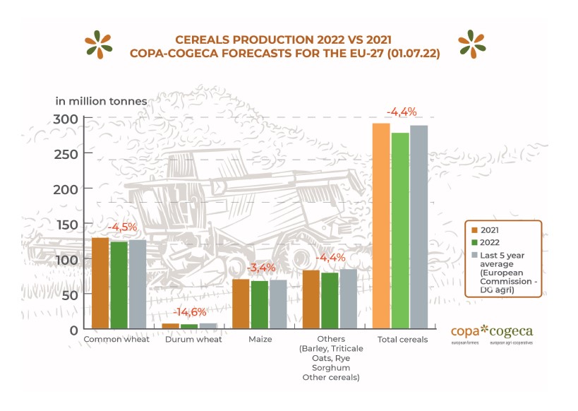 Ειδικότερα, οι εμπειρογνώμονες της Copa Copega, στα πλαίσια συνάντησης στις Βρυξέλλες, επιβεβαίωσαν τις προβλέψεις που είχε ανακοινώσει ο οργανισμός τον περασμένο Ιούλιο. Στο σύνολο των 27 χωρών της ΕΕ η παραγωγή σιτηρών αναμένεται να φθάσει τους 269 εκατ. τόνους, καταγράφοντας σημαντική μείωση κατά 6,8% σε σύγκριση με την συγκομιδή του 2021. Παράλληλα, μια πιο θετική τάση αναμένεται για τους ελαιούχους σπόρους (31,9 εκατ. τόνοι, +7,2%) και τις πρωτεϊνούχες καλλιέργειες (3,92 εκατομμύρια τόνοι, 5,1%).