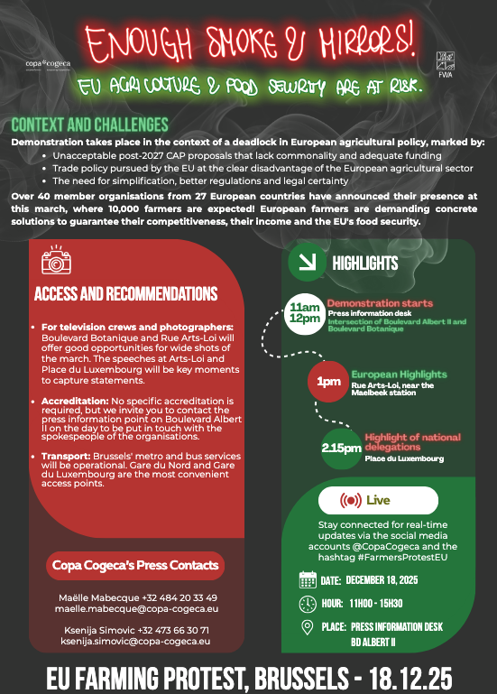 Την Πέμπτη 18 Δεκεμβρίου, 10.000 αγρότες από περισσότερους από 40 εθνικούς οργανισμούς από 27 κράτη μέλη θα πραγματοποιήσουν πορεία για να επισημάνουν το βάθος της κρίσης που αντιμετωπίζει ο τομέας, με βασικά αιτήματα προς τα θεσμικά όργανα της ΕΕ, μεταξύ των οποίων ένα δίκαιο και διαφανές εμπόριο.