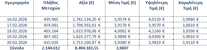 Η «Τράπεζα Eurobank Ανώνυμη Εταιρεία» (εφεξής η «Eurobank» ή η «Τράπεζα»), σε συνέχεια της από 12.12.2025 ανακοίνωσής της σχετικά με την έναρξη εφαρμογής του Προγράμματος Επαναγοράς Ιδίων Μετοχών («Πρόγραμμα»), το οποίο εγκρίθηκε με την απόφαση της Έκτακτης Γενικής Συνέλευσης των Μετόχων της Τράπεζας στις 22.10.2025, σύμφωνα με το άρθρο 49 του ν. 4548/2018, σε συνέχεια του αντίστοιχου προγράμματος της «Eurobank Ergasias Υπηρεσιών και Συμμετοχών Ανώνυμη Εταιρεία» («Eurobank Holdings») που θεσπίστηκε με την απόφαση της από 30.04.2025 Τακτικής Γενικής Συνέλευσης των Μετόχων της τελευταίας, και σε συνέχεια της από 22.10.2025 απόφασης του Διοικητικού Συμβουλίου της, ενημερώνει το κοινό ότι κατά το διάστημα 16.02.2026 – 20.02.2026 απέκτησε συνολικά, στο πλαίσιο του Προγράμματος, 2.144.612 μετοχές εκδόσεως της ιδίας («Ίδιες Μετοχές») που διαπραγματεύονται στο Χρηματιστήριο Αθηνών («Χ.Α.»), με μέση τιμή κτήσης €3,9607 ανά μετοχή και συνολικό κόστος €8.494.183,55.