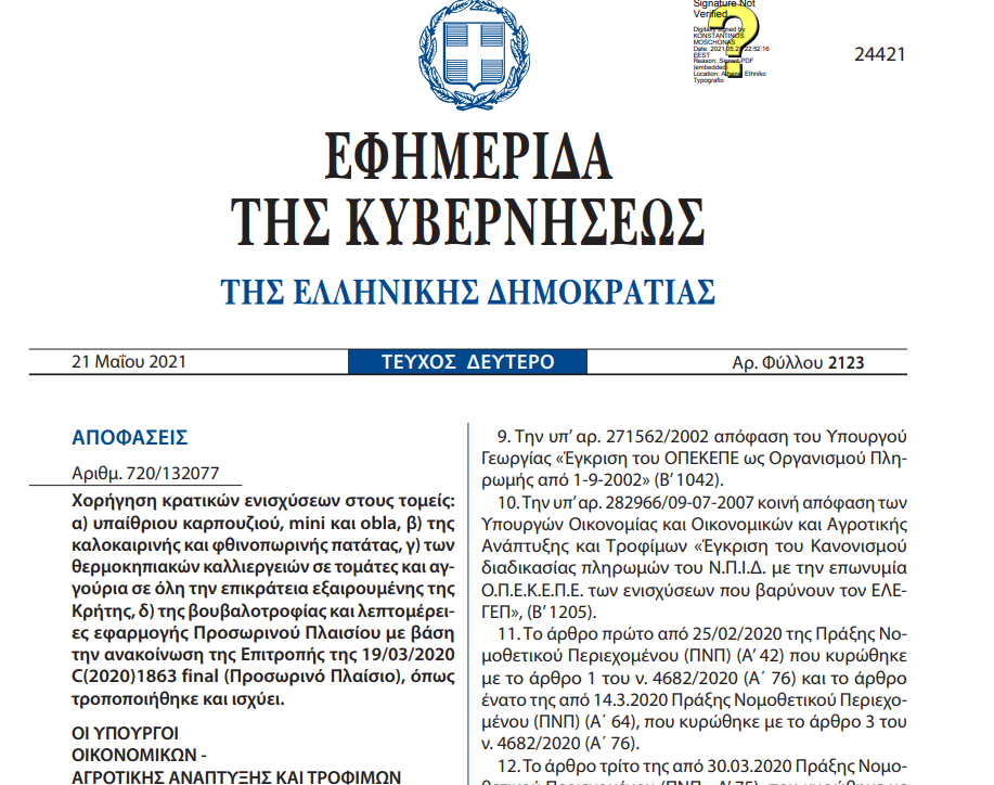 Η ΚΥΑ για την πληρωμή φθινοπωρινής πατάτας και όψιμου καρπουζιού, έχει υπογραφεί από τα υπουργεία Αγροτικής Ανάπτυξης και Τροφίμων και Οικονομικών και βρίσκεται ήδη για ΦΕΚ. Μόλις η απόφαση δημοσιευθεί στην Εφημερίδα της Κυβερνήσεως θα αρχίσει η αποζημίωση των καλλιεργητών από τις ζημιές που υπέστησαν λόγω της πανδημίας.