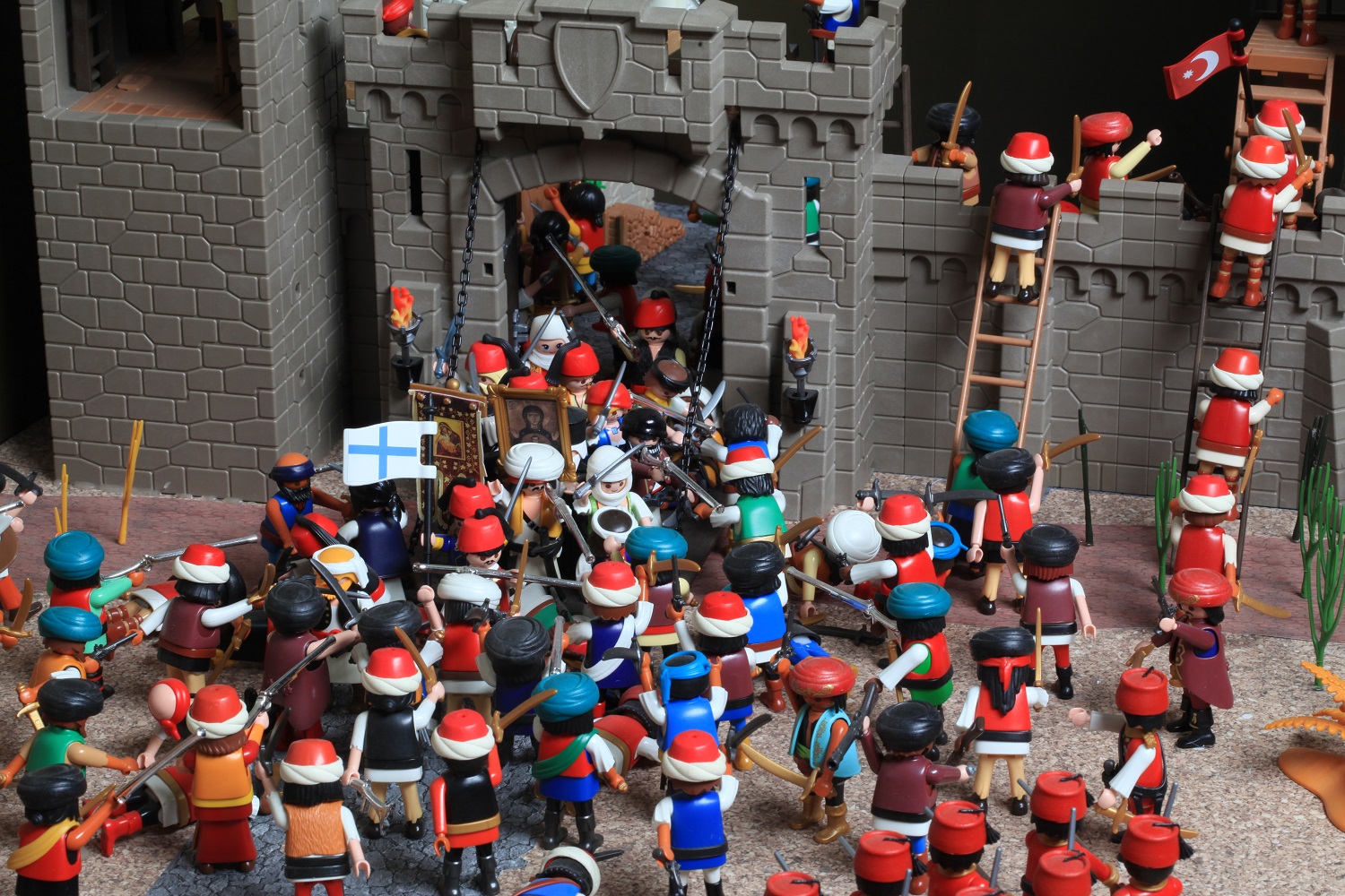 Η έκθεση σχεδιάστηκε από το ΕΙΜ, όπου και παρουσιάστηκε πρώτη φορά (13.10.2019-13.9.2020), σε συνεργασία με ομάδα συλλεκτών και με τη στήριξη της PLAYMOBIL Hellas. Στο πλαίσιο της συνεργασίας του Πολιτιστικού Ιδρύματος Ομίλου Πειραιώς με το Εθνικό Ιστορικό Μουσείο, η έκθεση ξεκίνησε το ταξίδι της από το Μουσείο Ελιάς και Ελληνικού Λαδιού, στη Σπάρτη (14.10.2020-31.5.2021), μεταφέρθηκε στη Λέσβο (16.06.2020-17.10.2020) και ολοκληρώνει την επιτυχημένη διαδρομή της στο Μουσείο Πλινθοκεραμοποιίας, στον Βόλο.