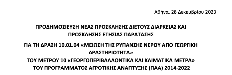 πρόσκλησης ετήσιας παράτασης για τη δράση 10.01.04 «μείωση της ρύπανσης νερού από γεωργική δραστηριότητα»