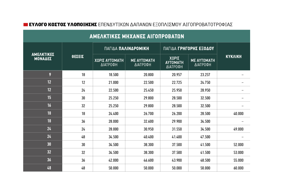 Ειδικότερα για τις σταβλικές εγκαταστάσεις, τα αµελκτήρια και τις παγολεκάνες στα Σχέδια Βελτίωσης θα επιδοτούνται ποσά έως το λεγόµενο «εύλογο κόστος» µε βάση τις προσφορές που έχει στα χέρια του ο κτηνοτρόφος. Με βάση τους πίνακες (βλ. σελ. 26-27) που ίσχυαν στην περασµένη προκήρυξη, και εκτός απροόπτου θα ισχύσουν και στη νέα, για τις συµβατικές σταβλικές κατασκευές το εύλογο κόστος φτάνει τα 800 ευρώ ανά πρόβατο και τα 4.700 ευρώ ανά αγελάδα. Στα αµελκτήρια, το εύλογο κόστος είναι ανάλογο µε τις αµελκτικές µονάδες.