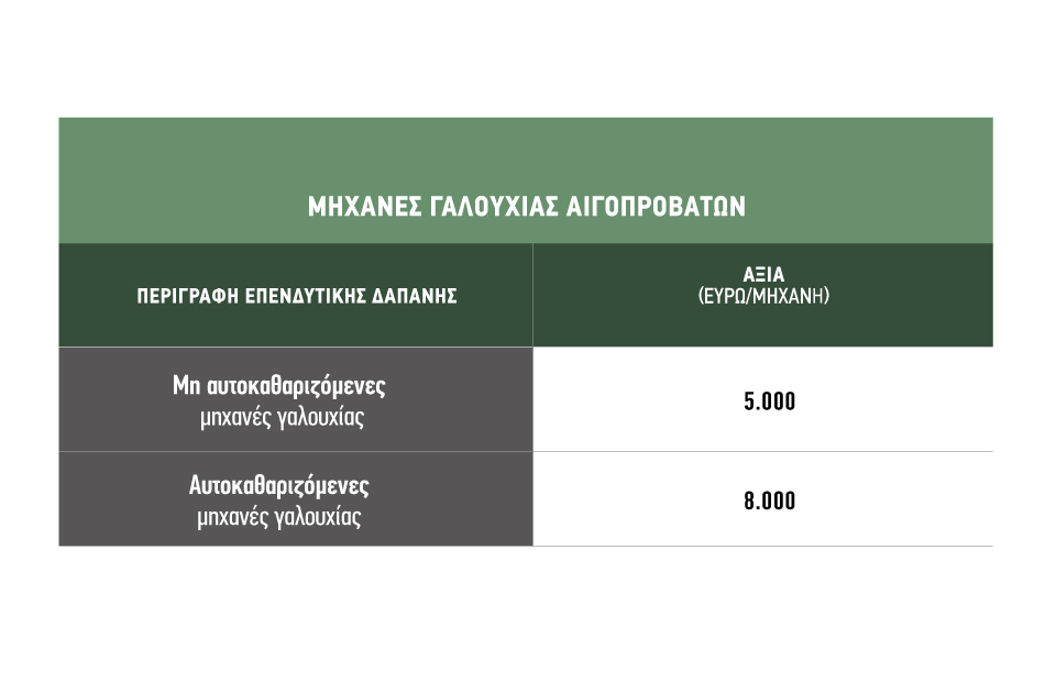 Στους πίνακες που φιλοξενεί η Agrenda και προέρχονται από την περασµένη πρόσκληση των Σχεδίων Βελτίωσης (Μέτρο 4.1.5) η ανώτατη επιλέξιµη δαπάνη ανά ζώο περιλαµβάνει, πέραν των κτιριακών, τον εξοπλισµό, την περίφραξη και τη δαπάνη της οικοδοµικής άδειας. Αναλυτικότερα, α) στα κτιριακά περιλαµβάνεται ο κύριος στάβλος και οι αποθηκευτικοί χώροι (πλην σιλό) των κτηνοτροφικών εγκαταστάσεων ενώ δεν περιλαµβάνεται η δαπάνη επεξεργασίας αποβλήτων, ο χώρος του αµελκτηρίου, ο χώρος γάλακτος και ο χώρος εξυπηρέτησης προσωπικού και β) στον εξοπλισµό περιλαµβάνεται αποκλειστικά ο συµβατικός εξοπλισµός που ενσωµατώνεται στις ανωτέρω κτιριακές εγκαταστάσεις (π.χ. θέσεις ανάπαυσης αγελάδων –κρεβάτια, κάγκελα, ταΐστρες, ποτίστρες κ.λπ.). ∆εν περιλαµβάνεται ο λοιπός εξοπλισµός όπως, τα παρασκευαστήρια ζωοτροφών (π.χ. χαρµανιέρα, σφυρόµυλος, κοχλίες, σιλό κ.λπ.), το αµελκτήριο, ο εξοπλισµός διανοµής του σιτηρεσίου (π.χ. ενσιρωδιανοµέας) κ.λπ.
