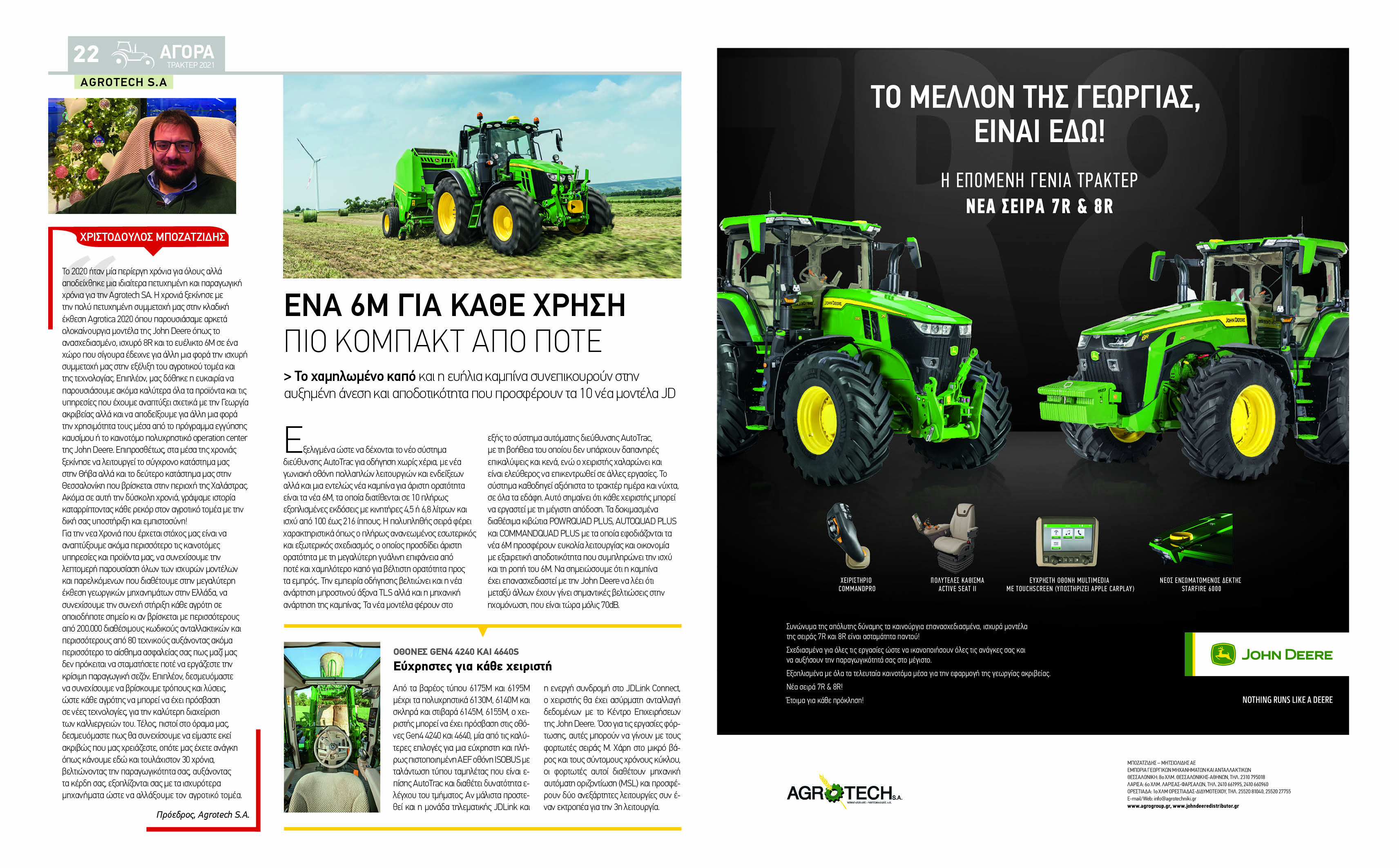 Το 2020 ήταν µία περίεργη χρόνια για όλους αλλά αποδείχθηκε µια ιδιαίτερα πετυχηµένη και παραγωγική χρόνια για την Agrotech SA. Η χρονιά ξεκίνησε µε την πολύ πετυχηµένη συµµετοχή µας στην κλαδική έκθεση Agrotica 2020 όπου παρουσιάσαµε αρκετά ολοκαίνουργια µοντέλα της John Deere όπως το ανασχεδιασµένο, ισχυρό 8R και το ευέλικτο 6M σε ένα χώρο που σίγουρα έδειχνε για άλλη µια φορά την ισχυρή συµµετοχή µας στην εξέλιξη του αγροτικού τοµέα και της τεχνολογίας. Επιπλέον, µας δόθηκε η ευκαιρία να παρουσιάσουµε ακόµα καλύτερα όλα τα προϊόντα και τις υπηρεσίες που έχουµε αναπτύξει σχετικά µε την Γεωργία ακριβείας αλλά και να αποδείξουµε για άλλη µια φορά την χρησιµότητα τους µέσα από το πρόγραµµα εγγύησης καυσίµου ή το καινοτόµο πολυχρηστικό operation center της John Deere. Επιπροσθέτως, στα µέσα της χρονιάς ξεκίνησε να λειτουργεί το σύγχρονο κατάστηµα µας στην Θήβα αλλά και το δεύτερο κατάστηµα µας στην Θεσσαλονίκη που βρίσκεται στην περιοχή της Χαλάστρας. Ακόµα σε αυτή την δύσκολη χρονιά, γράψαµε ιστορία καταρρίπτοντας κάθε ρεκόρ στον αγροτικό τοµέα µε την δική σας υποστήριξη και εµπιστοσύνη!