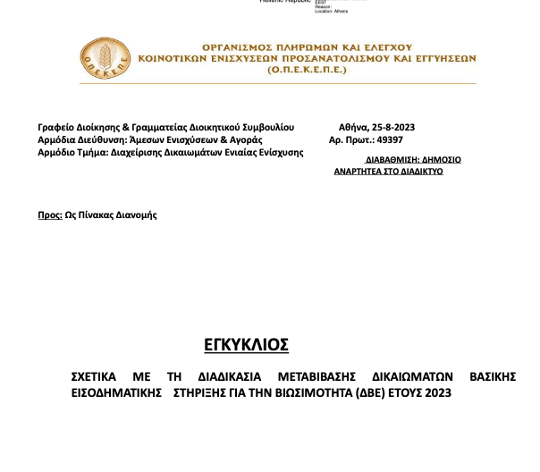 1. Η περίοδος υποβολής της αίτησης μεταβίβασης δικαιωμάτων βασικής ενίσχυσης για το έτος ενίσχυσης 2023 ορίζεται από 10/9/2023 έως 10/10/2023.