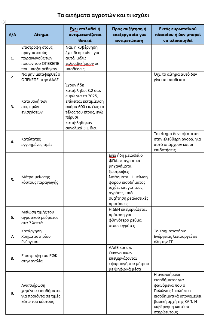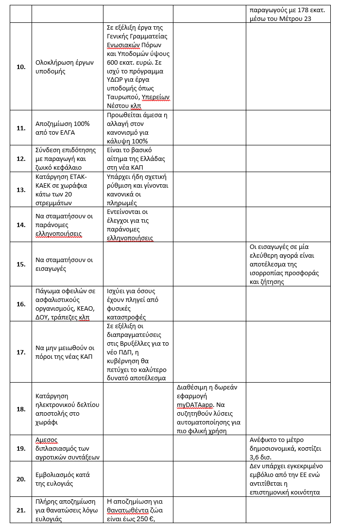 Από τον κατάλογο με τα 27 αιτήματα των αγροτών τα 16 ήδη έχουν ικανοποιηθεί ή αντιμετωπίζονται θετικά, 4 βρίσκονται υπό επεξεργασία ή συζήτηση προκειμένου να βρεθεί λύση και μόνο 7 δεν μπορούν να επιλυθούν είτε γιατί προσκρούουν σε βασικούς ευρωπαϊκούς κανόνες και στη λειτουργία της ΚΑΠ είτε γιατί είναι ανέφικτα δημοσιονομικά