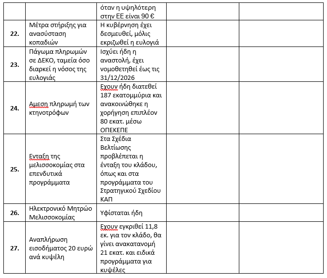 - Ένταξη μελισσοκομίας στα επενδυτικά προγράμματα Στην προδημοσίευση των Σχεδίων Βελτίωσης εντάσσουμε τους μελισσοκόμους στην ίδια προτεραιότητα με τη ζωική παραγωγή. Ο κλάδος έχει ενταχθεί στα προγράμματα νέων αγροτών και συμμετέχει σε επενδυτικά προγράμματα του ΣΣ ΚΑΠ. Για πρώτη φορά προβλέφθηκε συμμετοχή της βιολογικής μελισσοκομίας στο ΣΣΚΑΠ. Συμπεριλήφθηκε και στο 5.2 για ανασύσταση κυψελών μετά τον Daniel.