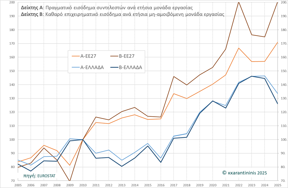 Το συχνά επαναλαμβανόμενο επιχείρημα του μικρού κλήρου (που πρέπει να μεγαλώσει ώστε το εισόδημα να μοιράζεται σε λιγότερες τσέπες) –να μειωθεί δηλαδή ο παρονομαστής του κλάσματος ώστε να αυξηθεί το κατά κεφαλήν επιχειρηματικό εισόδημα, είναι μόνο η μισή αλήθεια. Ο αριθμός των αγροτικών εκμεταλλεύσεων έχει ήδη μειωθεί δραματικά, από 834 χιλ. το 2005 σε 486 χιλ το 2023 - σχεδόν οι μισές - και συνεχίζουν να μειώνονται. Όμως ο αριθμητής του κλάσματος ανεβαίνει αγκομαχώντας μη μπορώντας να παρακολουθήσει τις ευρωπαϊκές τάσεις. Έτσι, το κατά κεφαλή αγροτικό εισόδημα στην Ελλάδα ενώ αυξάνεται - όμως αυξάνεται με μικρότερους ρυθμούς από ότι στην υπόλοιπη Ευρώπη. Σίγουρα έχει μειωθεί το 2025 σε σχέση με το 2024, ενώ στην ΕΕ-27 αυξήθηκε όπως δείχνουν οι δείκτες Α και Β της EUROSTAT.