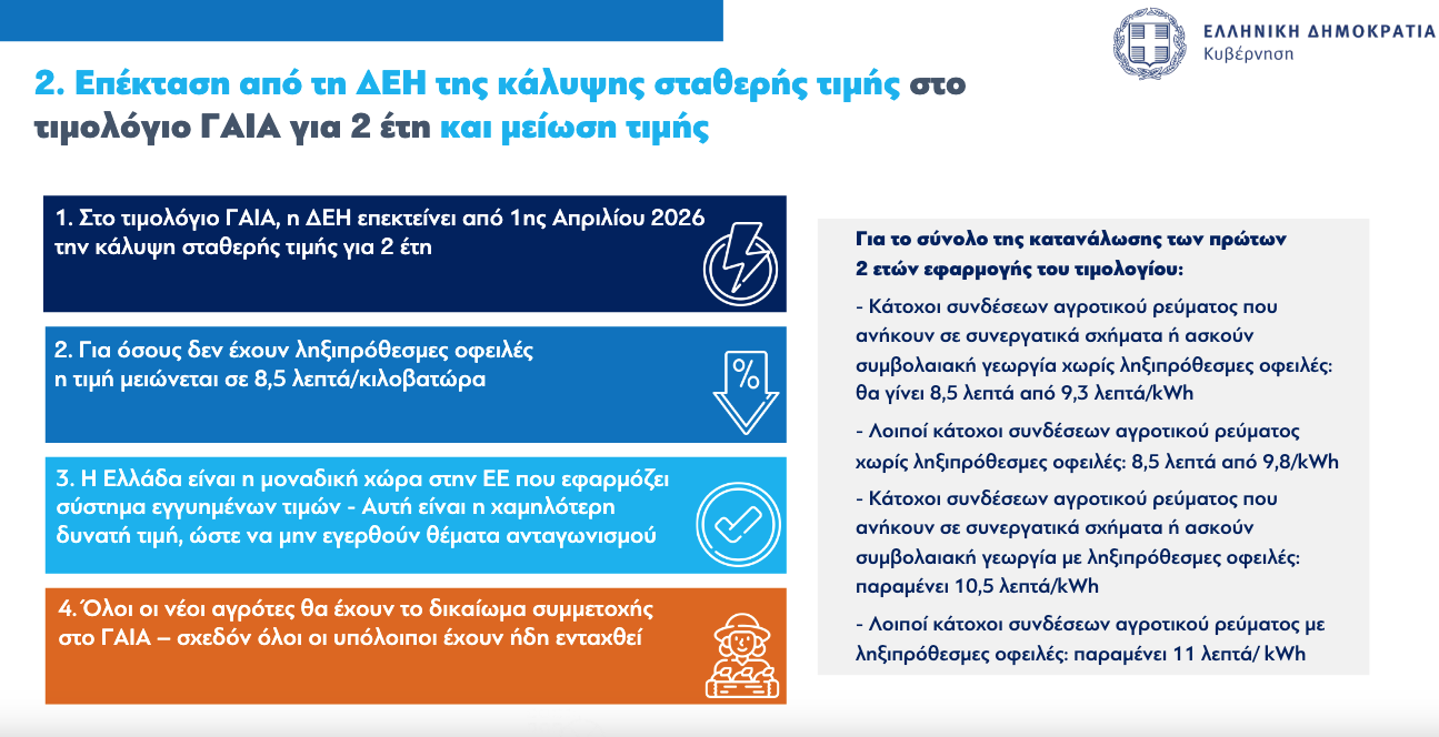 - Επέκταση από τη ΔΕΗ της κάλυψης σταθερής τιμής στο τιμολόγιο ΓΑΙΑ για 2 έτη και μείωση τιμής
