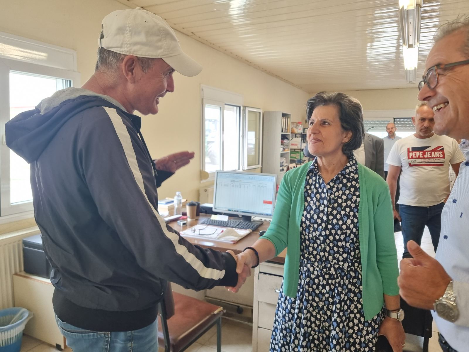 Στο πλαίσιο της περιοδείας η Γενική Γραμματέας συναντήθηκε, επίσης, στα γραφεία της Ένωσης Αγροτικών Συνεταιρισμών Δράμας με εκπροσώπους αγροτικών και κτηνοτροφικών συλλόγων και επισκέφθηκε την εμπορική αγορά της πόλης.