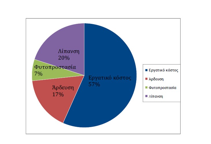 Στο διάγραμμα 2 παρουσιάζεται ο επιμερισμός του κόστους παραγωγής όταν για την άρδευση χρησιμοποιείται ο Ανάβαλος ή γεωτρήσεις χαμηλού ενεργειακού κόστους άντλησης με ένα μέσο κόστος άρδευσης 100 ευρώ/στρέμμα.