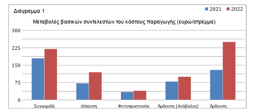 Όπως διαπιστώνεται, υπάρχουν σημαντικές αυξήσεις στο κόστος συγκομιδής, στην λίπανση και στην άρδευση. Η μεταβολή του κόστους άρδευσης είναι σημαντικά υψηλότερη όταν η άντληση γίνεται από μεγάλα βάθη με πιο ενεργοβόρα αντλητικά συγκροτήματα και σε μεγαλύτερη συχνότητα, γι’ αυτό και την παρουσιάζουμε με ξεχωριστό τρόπο.