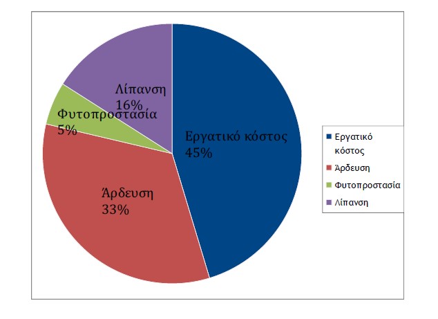 Στο επόμενο διάγραμμα παρουσιάζεται ο επιμερισμός του κόστους καλλιέργειας όταν χρησιμοποιούνται πιο ενεργοβόρα αντλητικά συγκροτήματα και εφαρμόζονται πιο συχνά διαστήματα άρδευσης οπότε και το κόστος άρδευσης μπορεί να ξεπερνά και τα 250 ευρώ/στρέμμα.